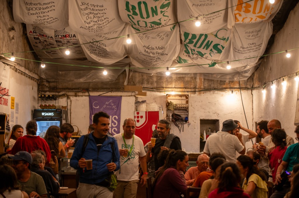 Fugimos para a sombra do SCOCS – Sport Club Operário de Cem Soldos. Sabe bem o abrigo da pedra fresca daquelas paredes, que contam histórias de famílias inteiras empenhadas em fazer da aldeia «um lugar em que as pessoas se sintam felizes», diz a senhora que me atende. Brindamos a lugares assim, a esta vida de marinheiro.